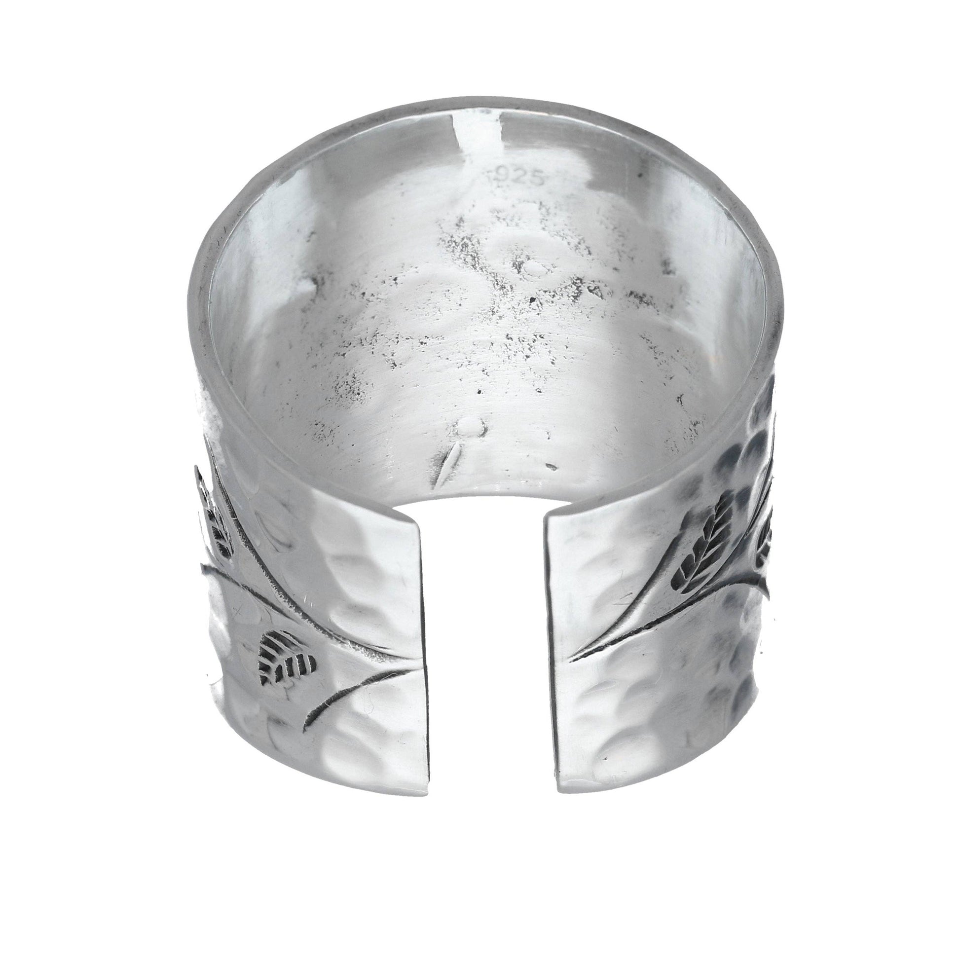 - * Extra Wide with a Hammered Finish Extra wide with a hammered finish, this handmade ring is etched with a leafy herbal sprig and is adjustable in back.