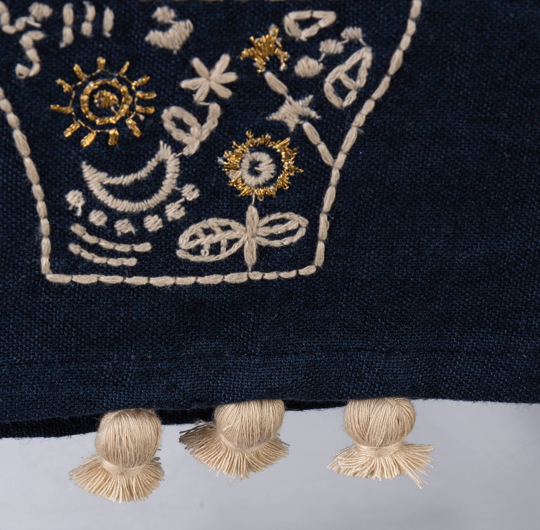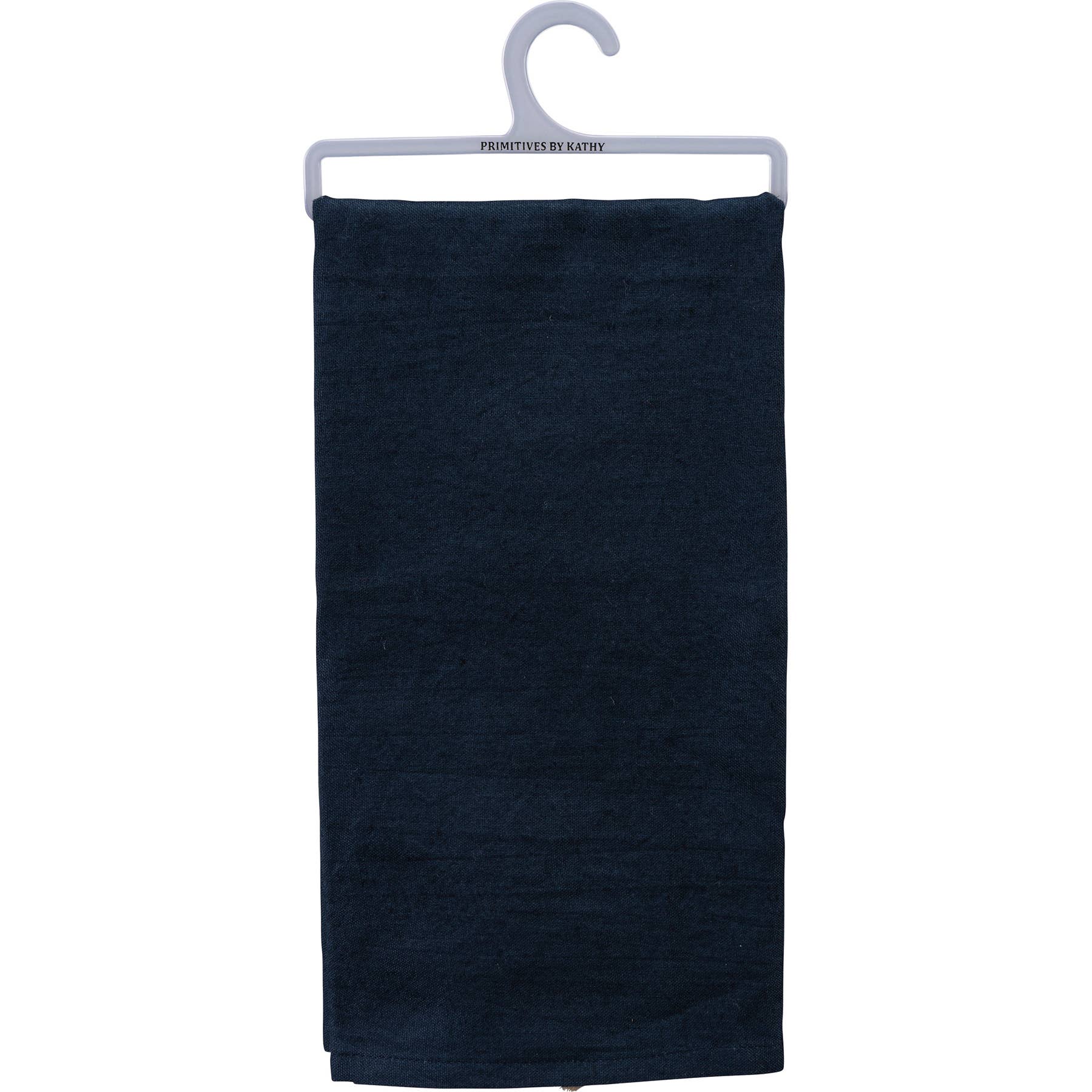 A navy blue cotton kitchen towel featuring embroidered "Good Things Are Going To Happen" sentiment and mystical hand design. Includes tassel accents for added interest. Machine-washable.