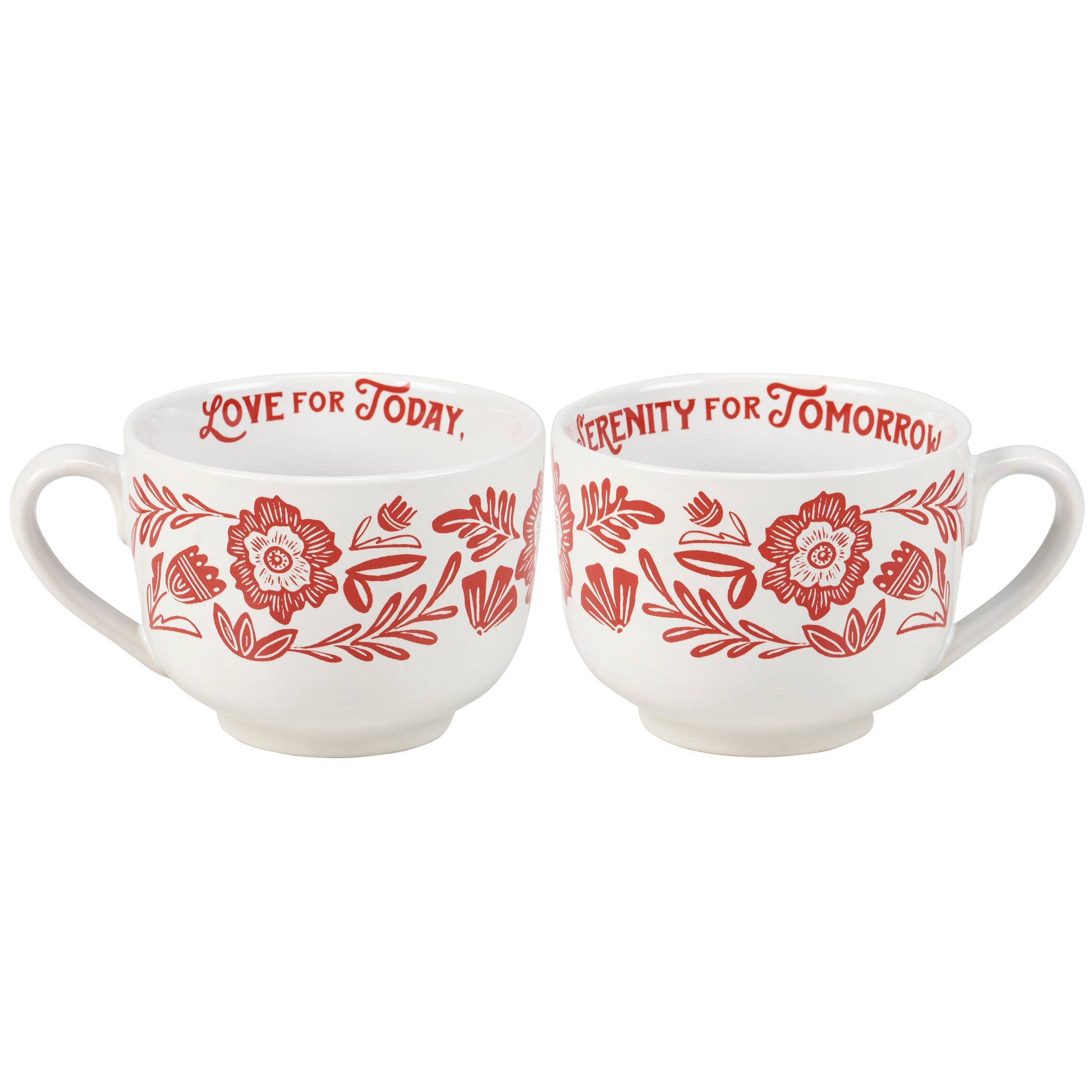 This 20 oz stoneware tea mug features a Folk Art red florals inspired by Scandinavian folk art. The inside design features inspirational words along the rim that reads "Love For Today - Serenity For Tomorrow" and a red peace dove at the bottom.