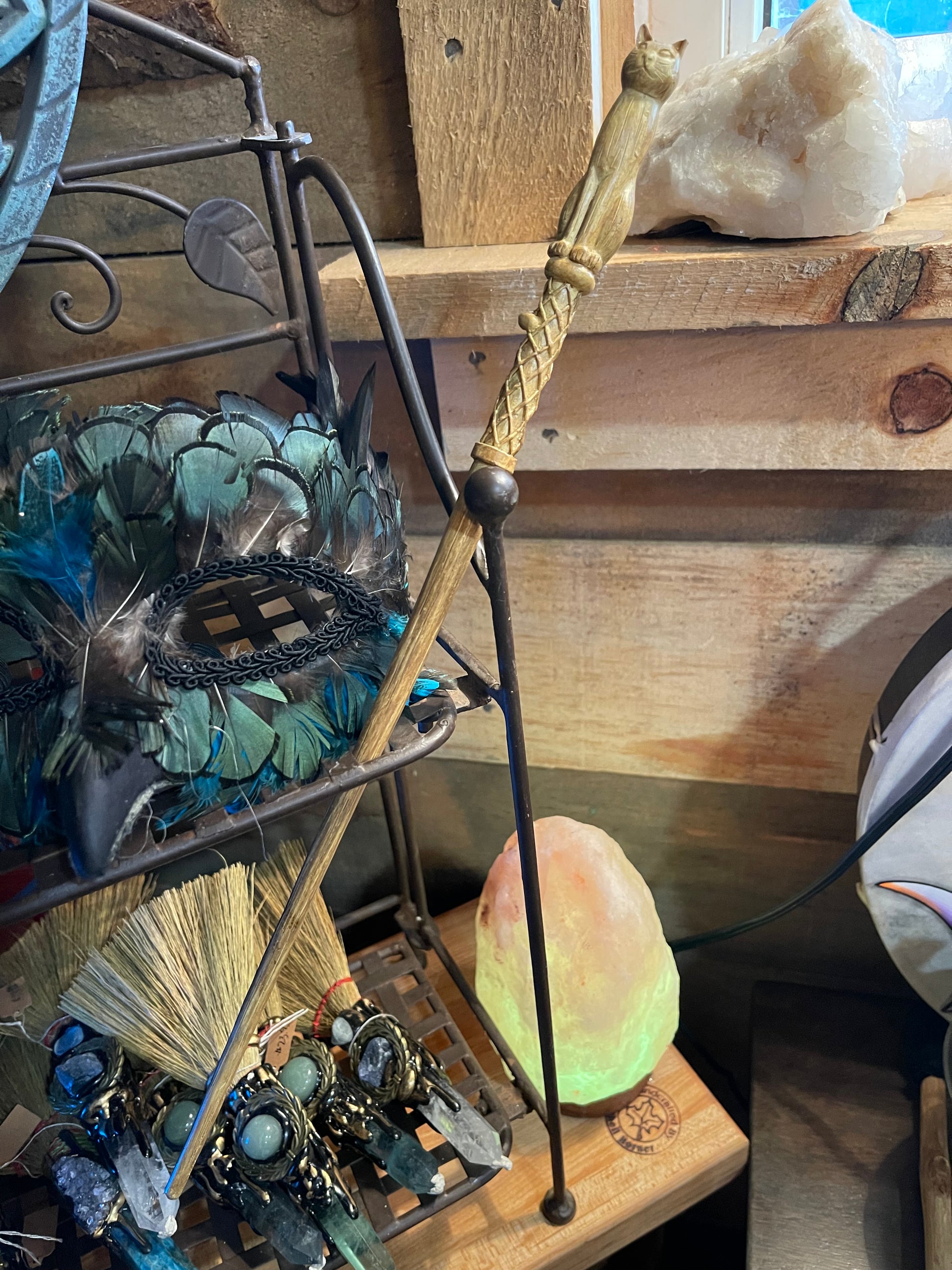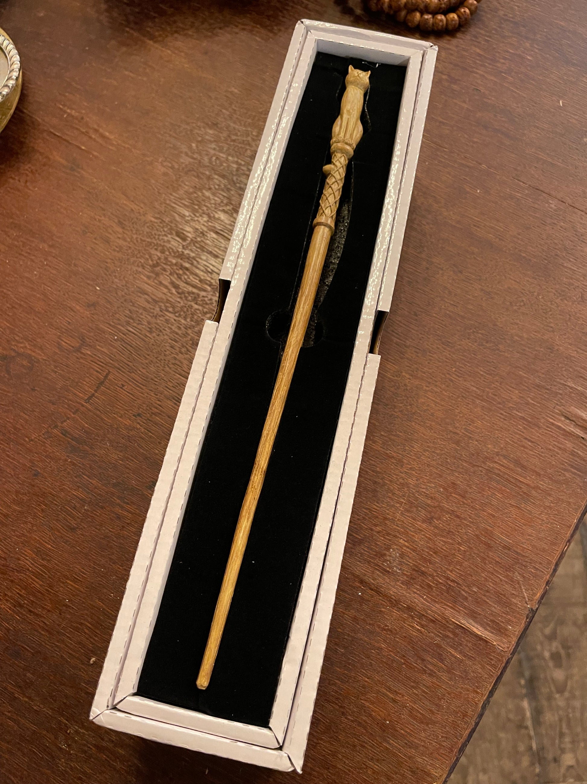 Mystic cat wooden wand with the case. Approximately 14 inches and intricately designed to harness the spirit animal energy.