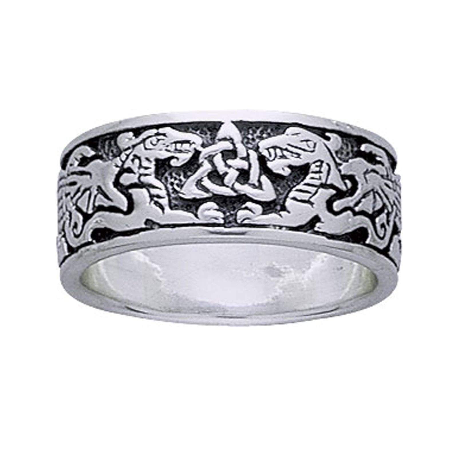 This band is large and solid. The Sacred Celtic Triangle Knot is enclosed by two powerful, guardian dragons. Solid Sterling Silver * Nickel Free Silver * Marked 925