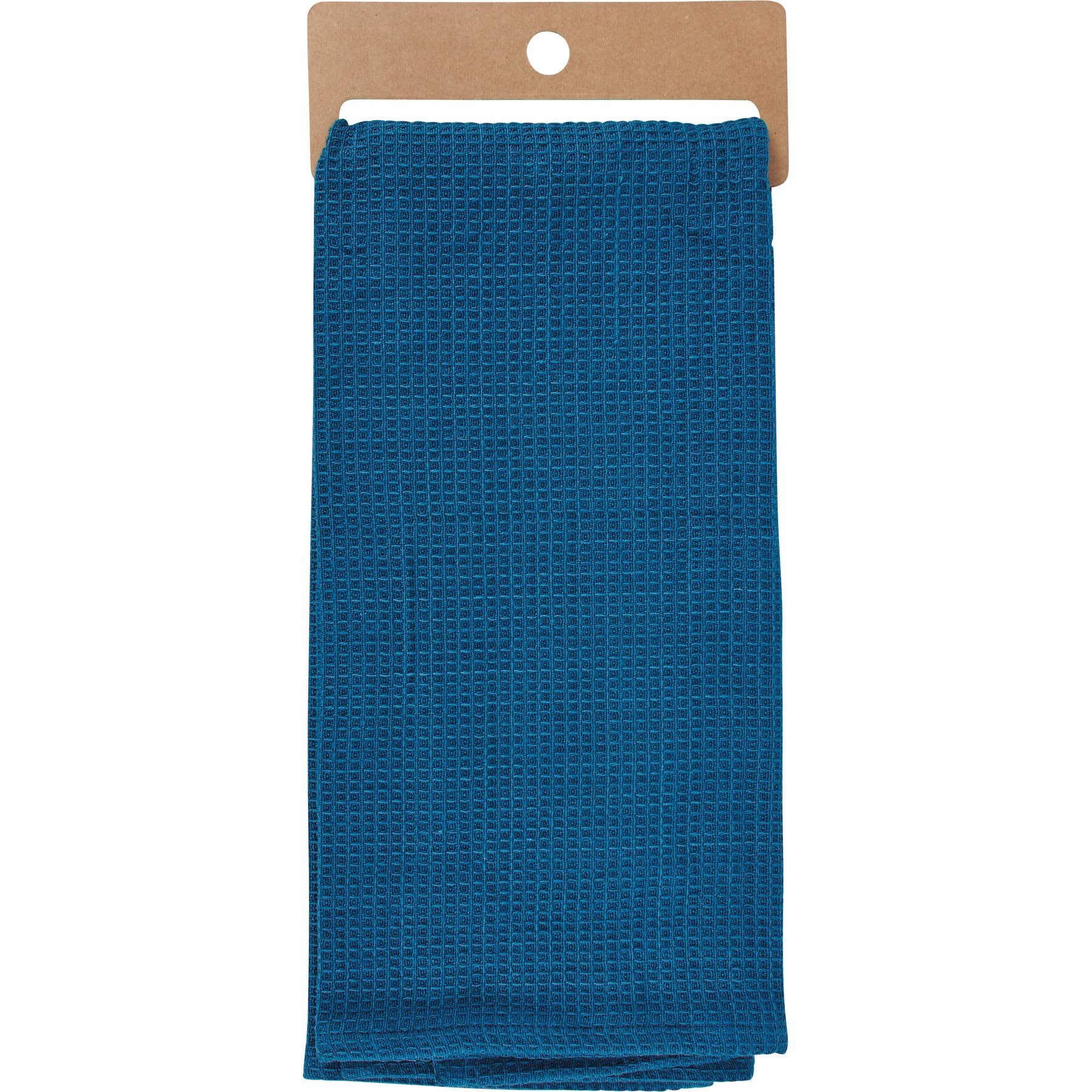A cotton kitchen towel featuring stitched art on blue waffle weave background. Art panel displays vibrant hand illustrated art of a rainbow and florals replicated from original wood burned art. Design includes motivational "Think Happy Thoughts" sentiment. Our Think Happy Thoughts kitchen towel is machine-washable for convenient cleaning.