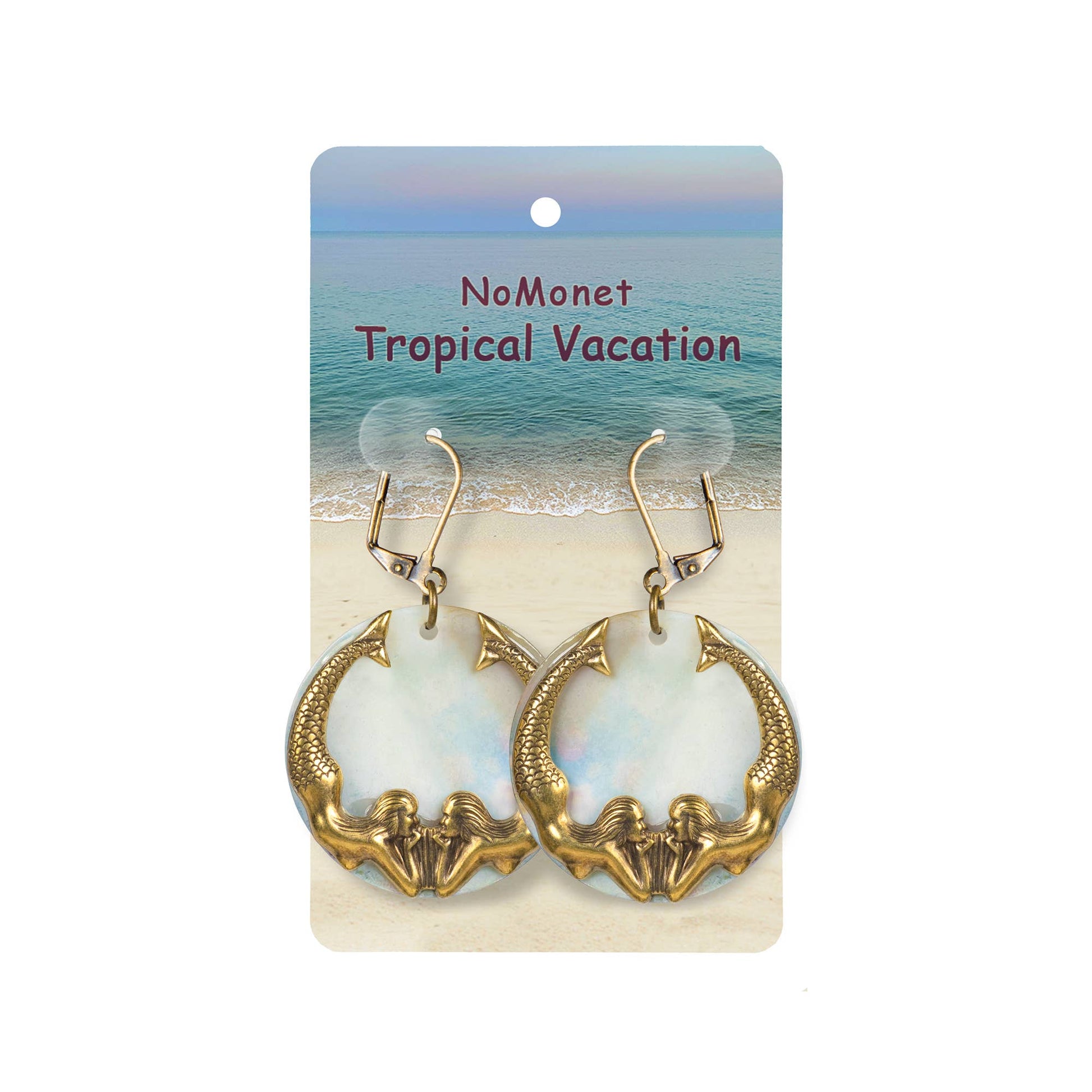 These Mermaid earrings by NoMonet feature round, multi-colored shells with two dramatic diving mermaids as the backdrops.