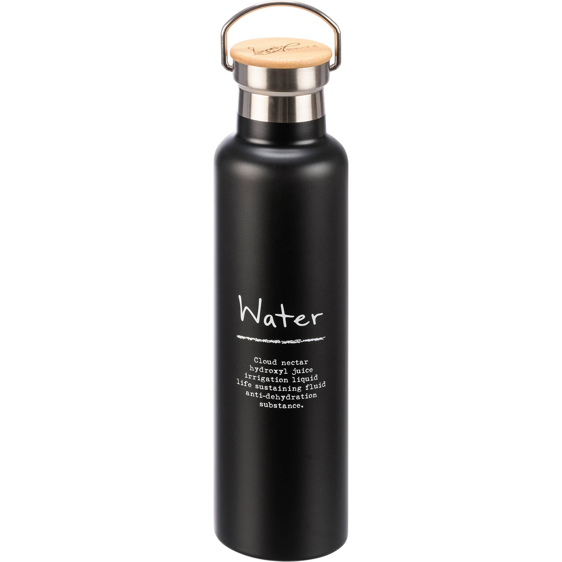 An insulated stainless steel bottle with bamboo accent and engraved logo on lid. Holds 25 oz. Hand wash only. BPA free.